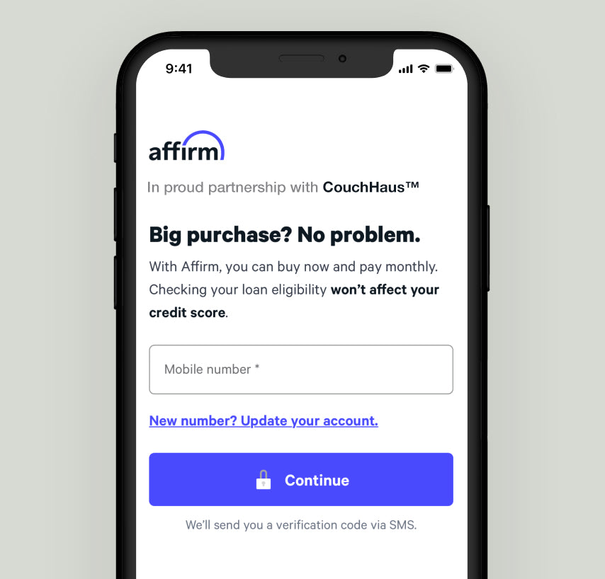 As an example, a $3,000 CouchHaus purchase might cost $500/mo over 6 months at 0% APR. A down payment may be required.